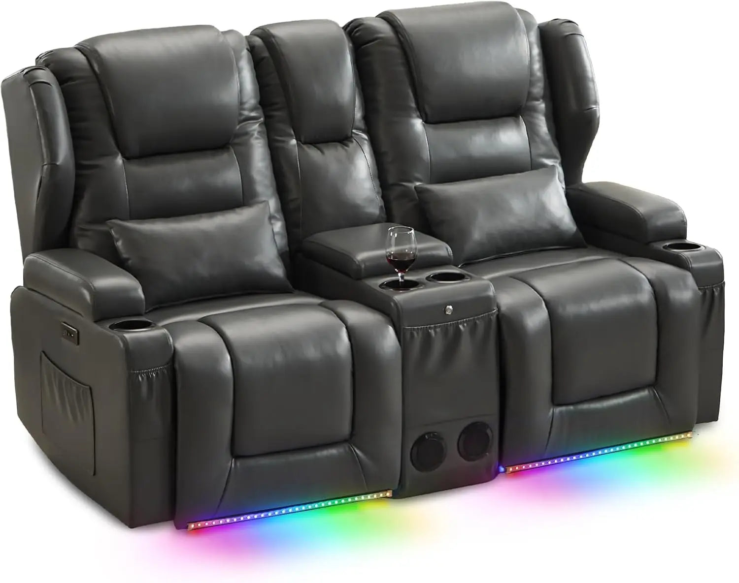 - Theater Ambiance: Elevate your home theater with this dual recliner, featuring Bluetooth speakers for music, 4 LED light (blue, red, green, multicolor) for ambiance, and 4 cup holders for drinks. Ideal for ultimate relaxation and entertainment