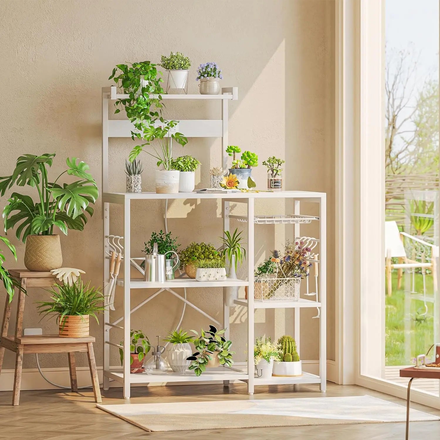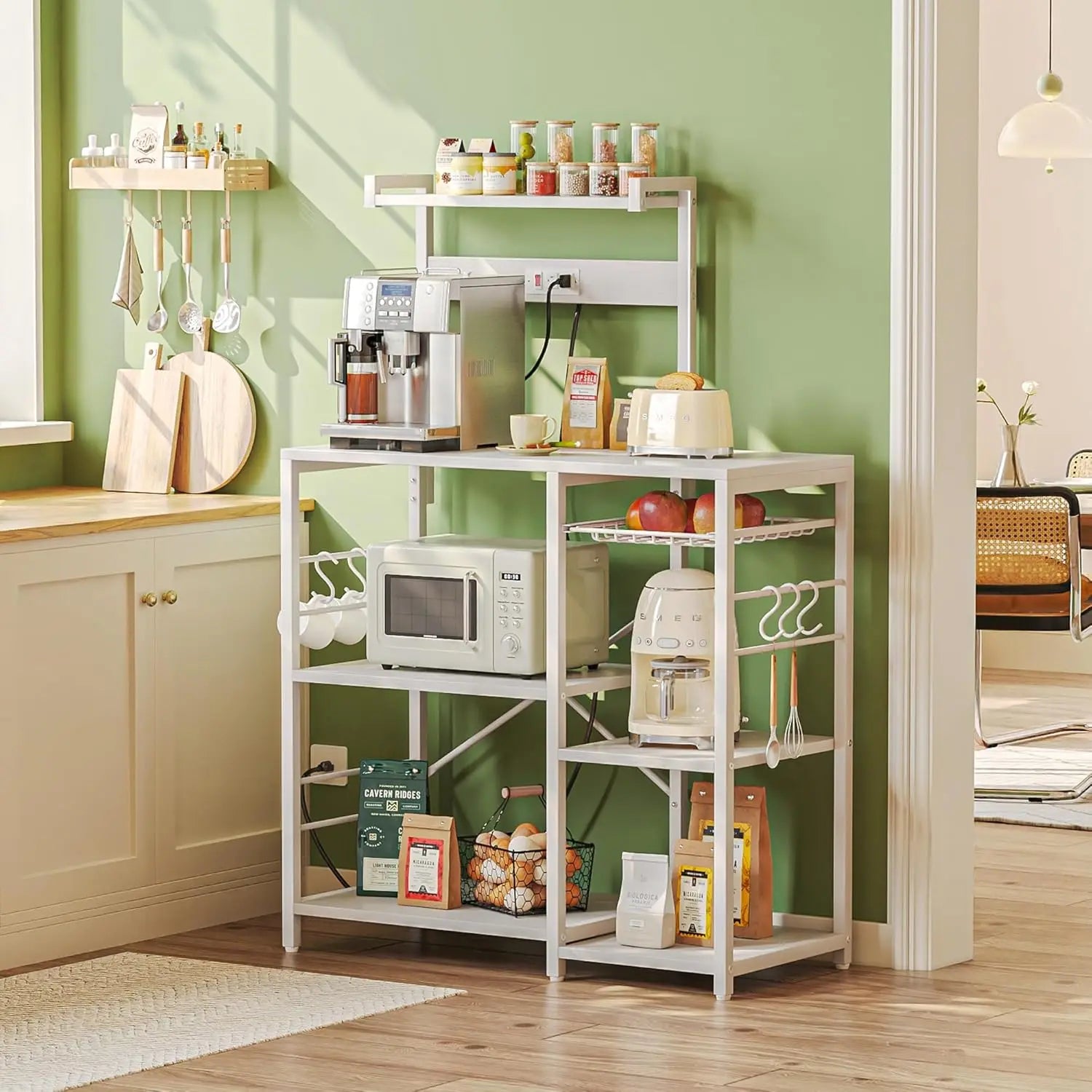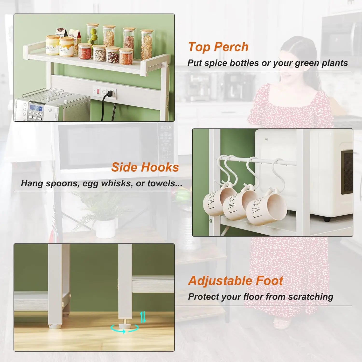 - [Kitchen Storage Expert]: Let the bakers racks for kitchens with storage be here to free up your countertop and cabinet. Spices on the perch close by hands; 6 S-shaped hooks hold gloves, ladles, mugs orderly; as to other gadgets, the shelves below warmly welcome