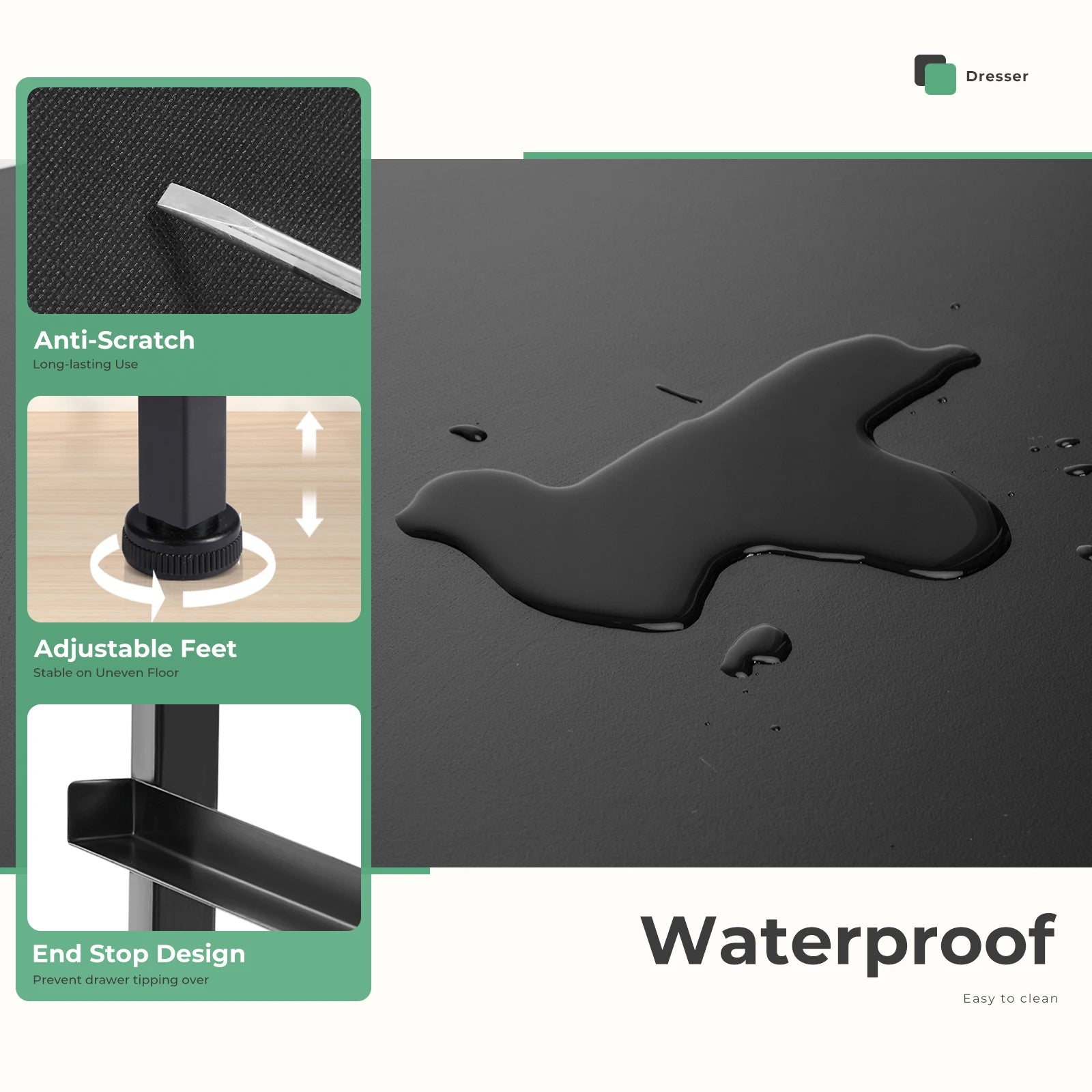 【Quality Construction】This fabric dresser combines water-resistant MDF board with a durable steel frame, make it sturdy under load 44 lb. Anti-tipping accessories are also equipped to prevent accidents.