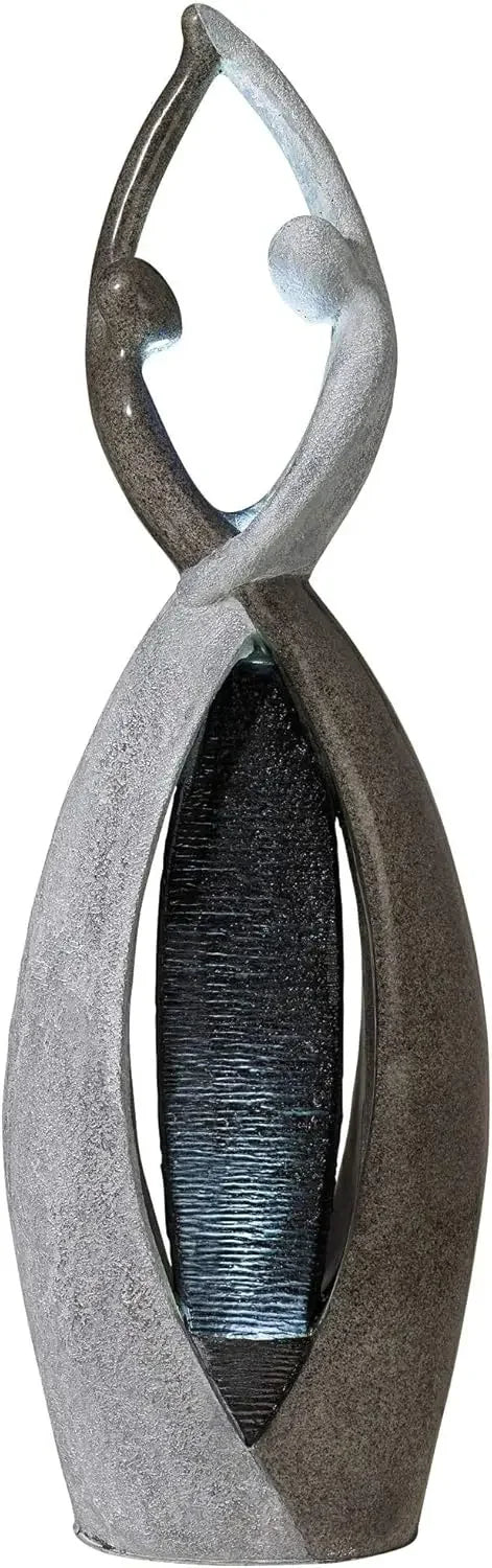 Water cascades and ripples down inner element into the lower water basin. Two built-in LEDs light the design at night. Lights are on whenever the fountain is plugged-in.