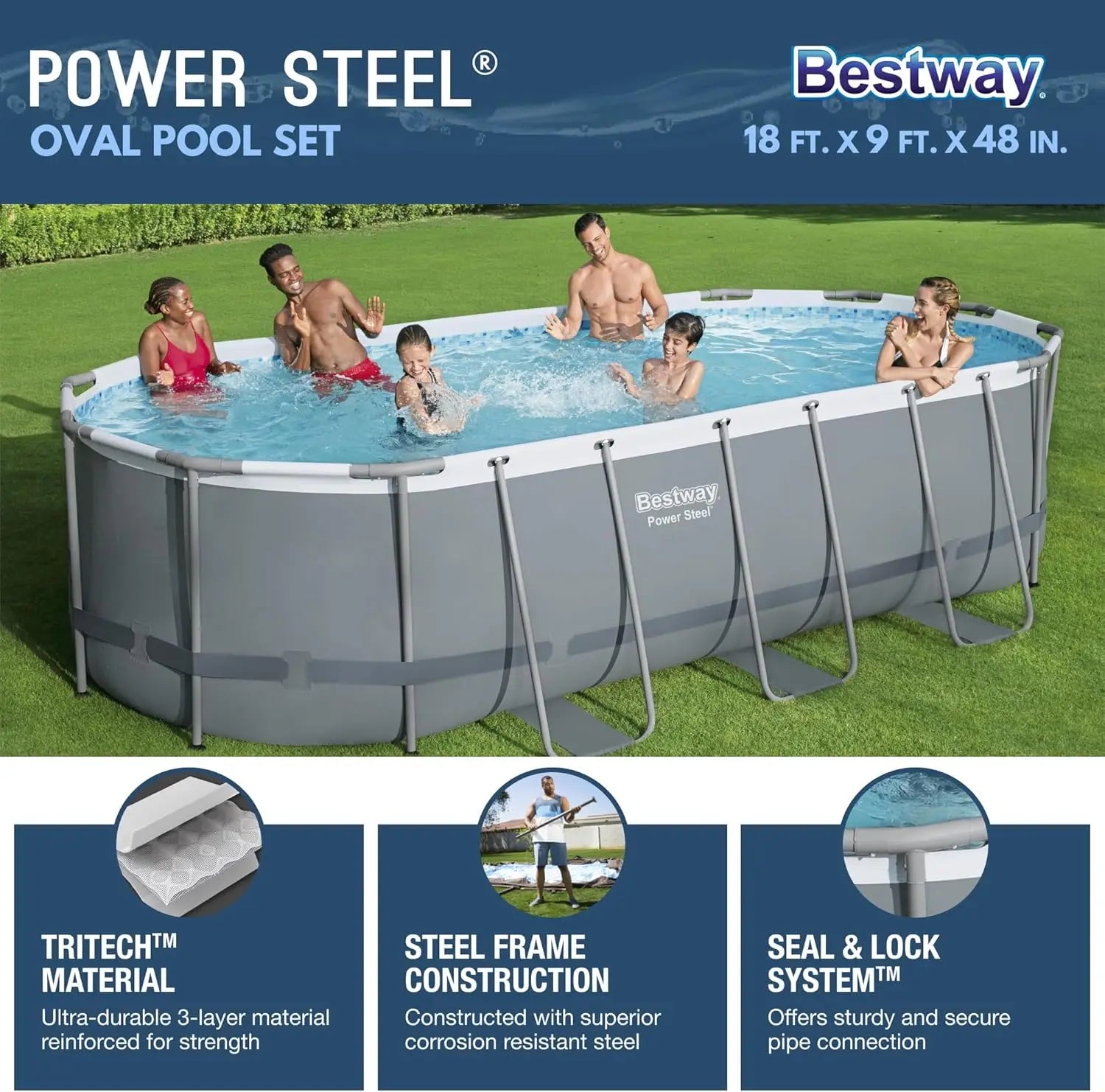All ages will enjoy swimming all summer long in the 18-foot by 9-foot by 48-inch above-ground pool; Includes a model 58390E 1,500 GPH filter pump, a ladder, and a convenient secure pool cover