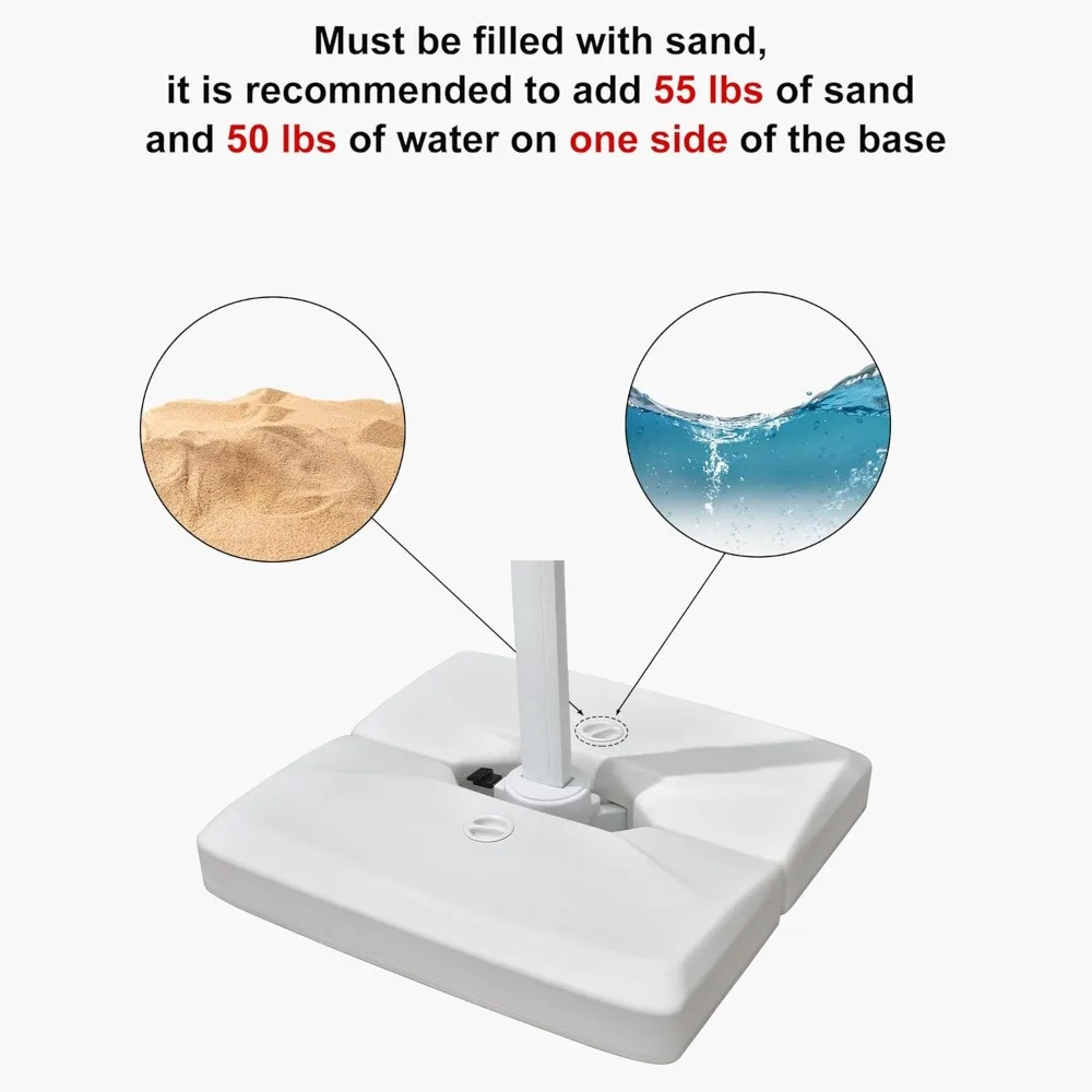 - The suggestion is to add 55 lbs of sand and 50 lbs of water on one side of the base; The other side is the same; your patio umbrella will be more sturdy and durable